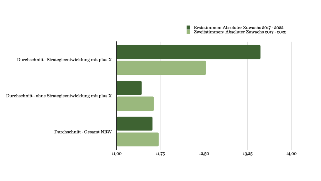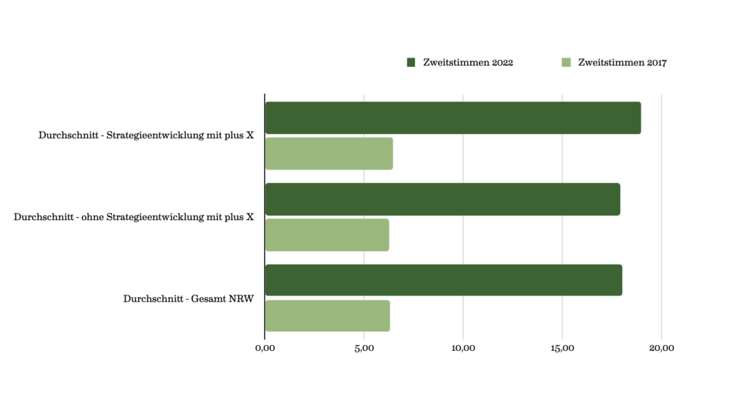 Bei den nordrhein-westfälischen Landtagswahlen 2022 durften wir 12 von 128 Kandidat*innen von Bündnis90/Die Grünen bei der Strategieentwicklung begleiten und haben diese teilweise auch rhetorisch gecoacht. Die Wahlkreise mit den wir zusammengearbeitet haben standen 2017 ganz ähnlich da, wie der Rest von NRW (bei den Erststimmen sogar um 0,36 Prozentpunkte schlechter und bei den Zweitstimmen 0,17 Prozentpunkte besser) und haben heute im Schnitt 1,7 Prozentpunkte mehr Erststimmen als die Wahlkreise, die nicht mit uns gearbeitet haben und gut 1 Prozent mehr Zweitstimmen.